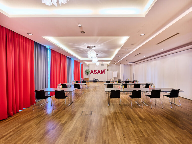 Der ASAM-Saal ist mit 400 m² der größte unserer Tagungsräume und bietet, je nach Bestuhlungsform, Platz bis zu 400 Personen. Ausgestattet mit 2 Beamern rechts und links der Bühne und einem Rückprojektionsbeamer (15000 Lumen) passend zur großen Leinwand in der Mitte sowie einer modernen Soundanlage ist dieser Konferenzsaal hervorragend für große Tagungen, Präsentationen oder Vorträge geeignet. Holzelemente, Tageslicht, eine 6 m hohe Decke sowie eine moderne Klimaanlage sorgen für ideales Raumklima. Das großzügige Foyer vor dem Tagungssaal bietet Raum für Kaffeepausen oder Ausstellungsflächen.