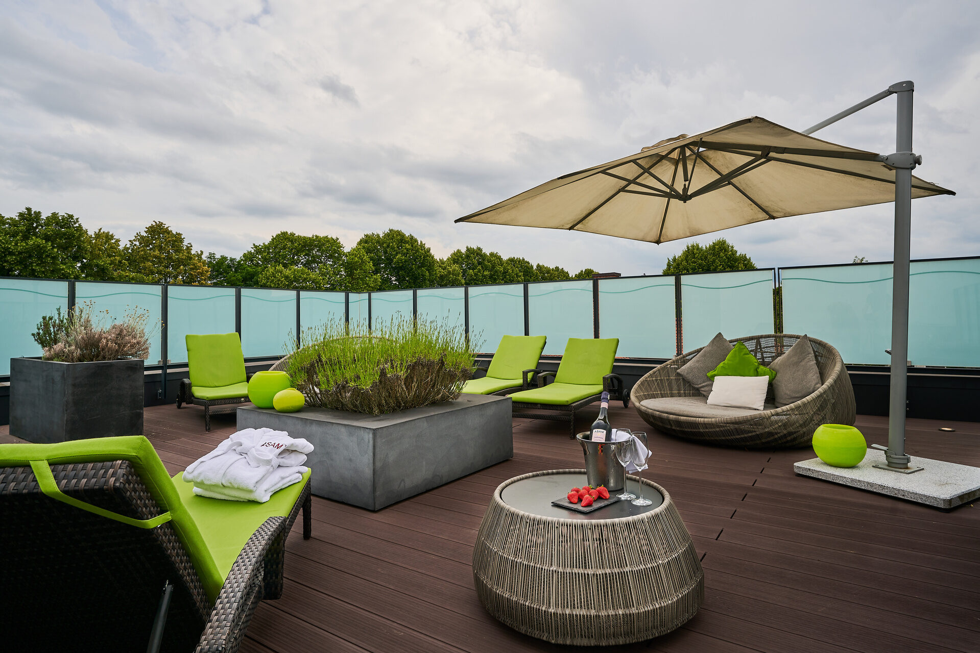 Zu den Ruhe-Zonen gehören moderne Wasserbetten, eine Sonnenwiese mit Wärmelampen, Liegen im Wintergarten und eine großzügige Dachterrasse zum Relaxen unter freiem Himmel.
