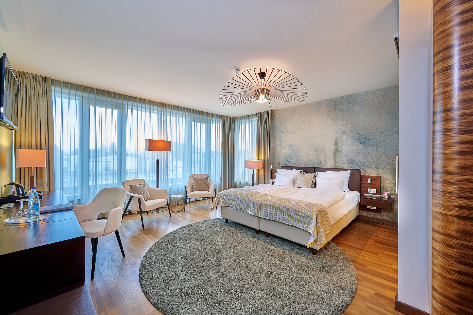 Die 47 Businesszimmer, 12 Komfortzimmer und 5 Suiten strahlen durch das edle Holz mit roten Elementen, dem hellen Eichenparkett und den dezente Glas-Illustrationen eine trendige und natürliche Wohlfühlatmosphäre aus.