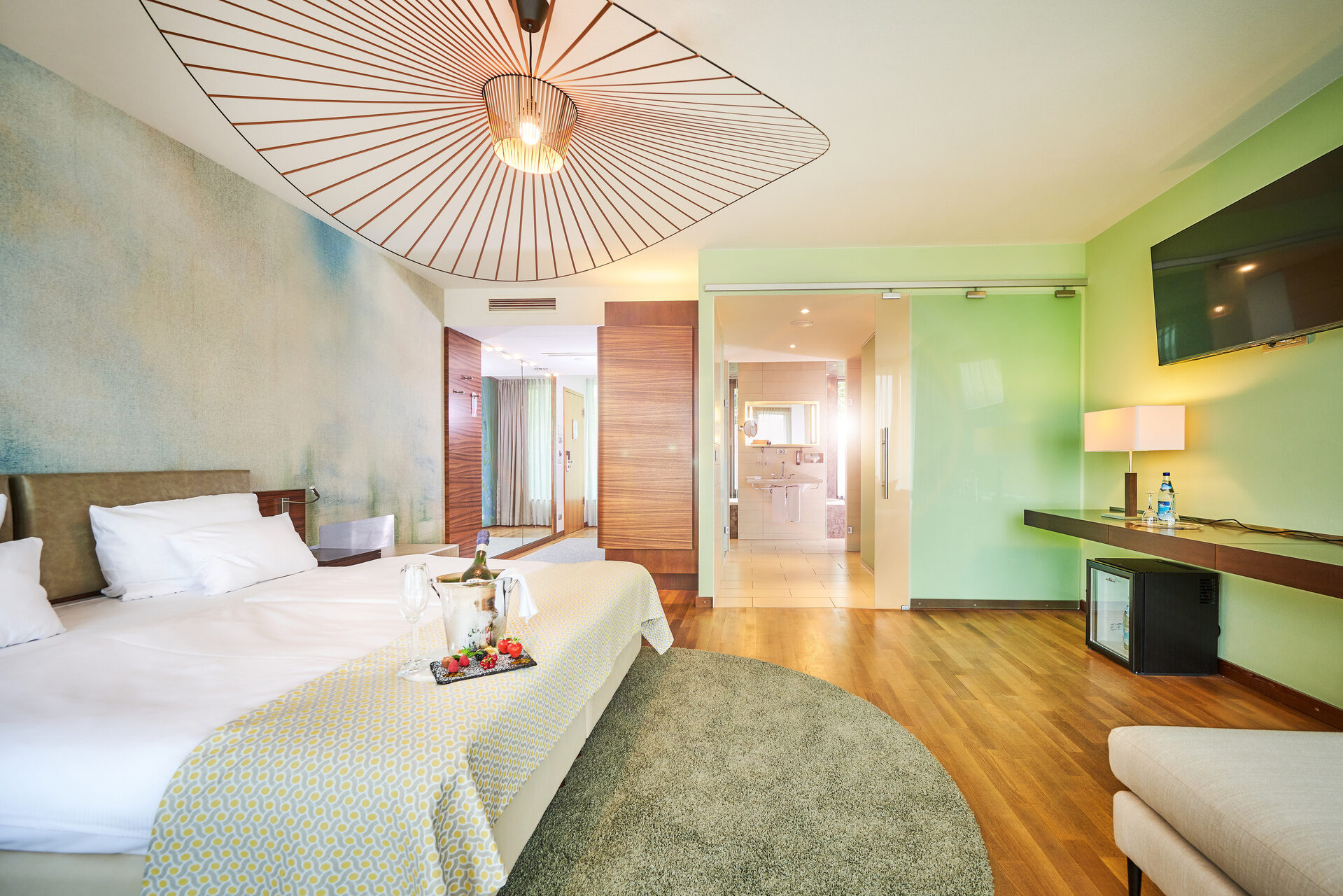 Weitere moderne Zimmer & Suiten mit edlem Holz und roten Elementen finden Sie in unserem Westflügel.