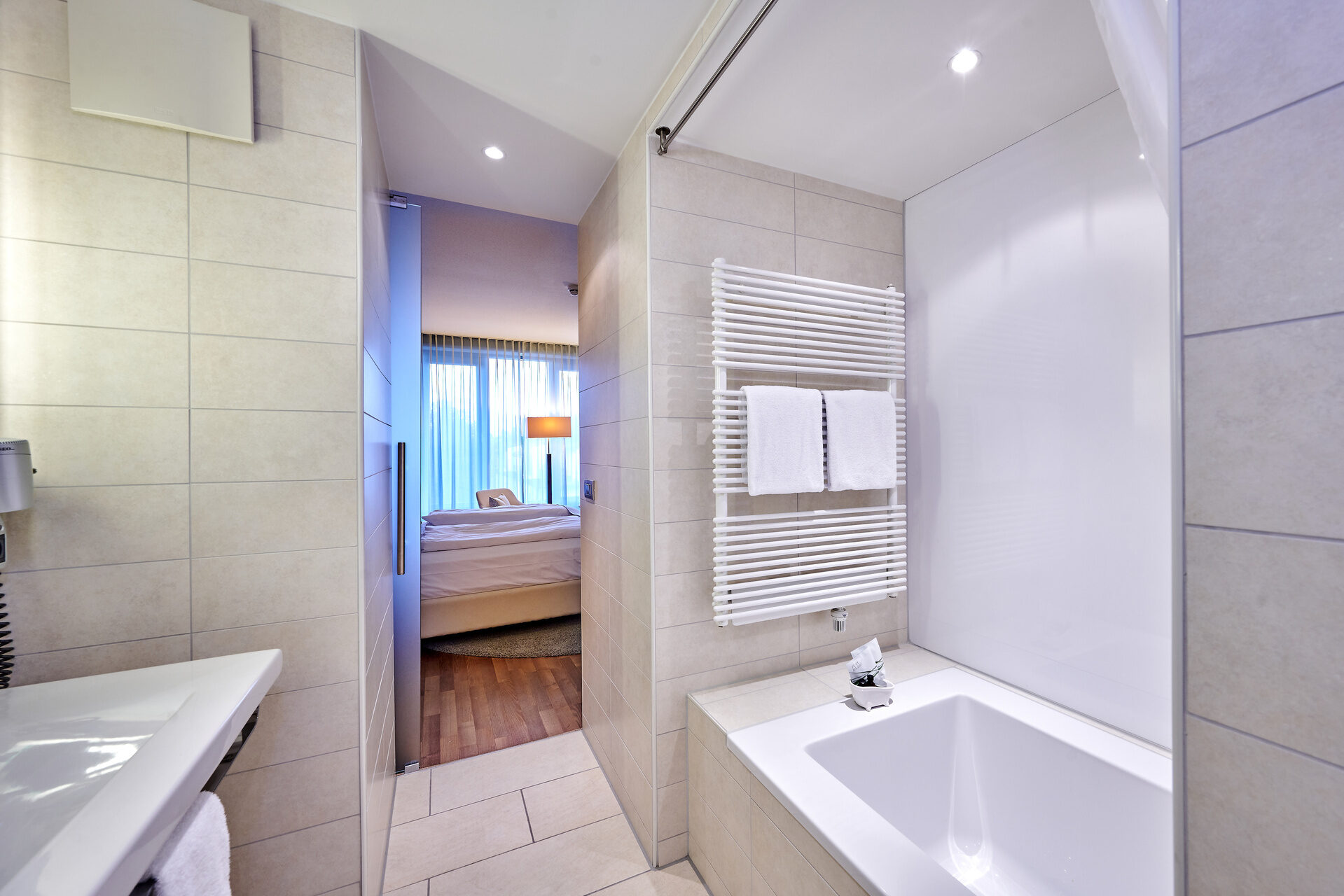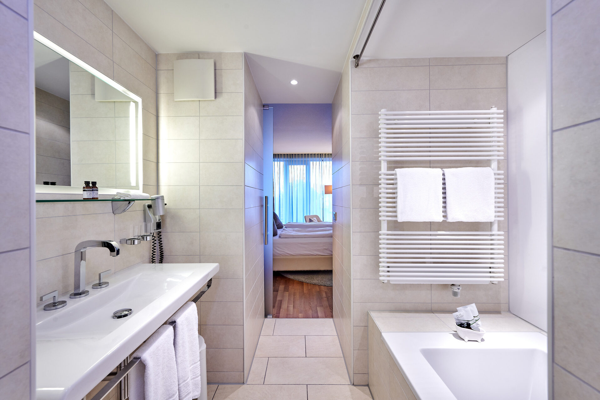 Unsere drei exklusiven, lichtdurchfluteten Zimmer mit den wunderbaren Parkettböden liegen im vierten Obergeschoss des Hotels. Der herrliche Blick reicht von Straubing bis in den Bayerischen Wald. Braune Naturtöne gepaart mit buntem Siebdruck auf Glas verleihen dem Superior-Doppelzimmer eine stilvolle, individuelle und warme Atmosphäre. Ein nobles, breites Doppelbett (1,80x2,10m) bietet genug Raum für absolute Entspannung. Eine satinierte Glasschiebetür führt zum stylischen Bad mit der Badewanne.Ausstattung