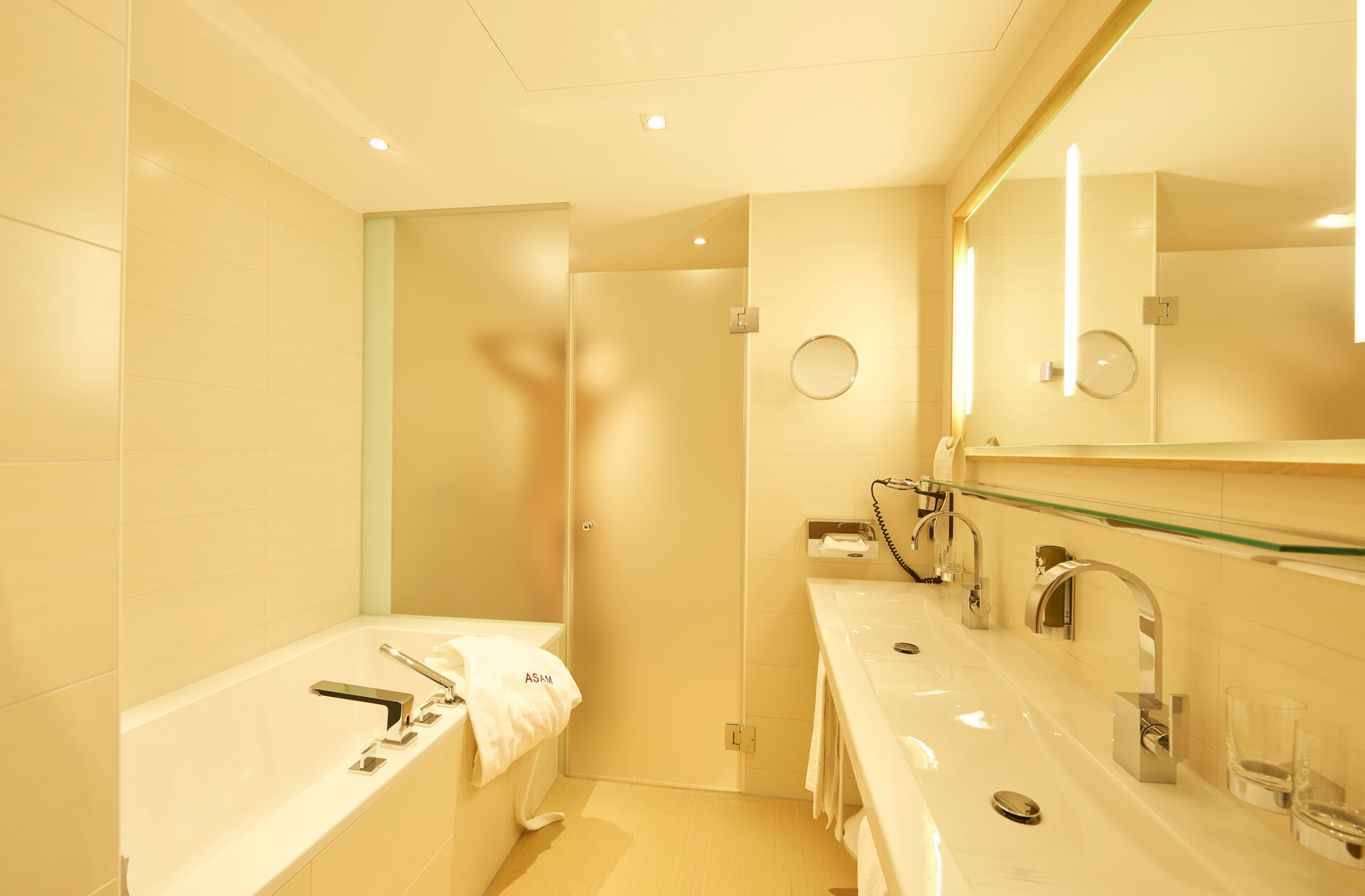 Die 47 Businesszimmer, 12 Komfortzimmer und 5 Suiten strahlen durch das edle Holz mit roten Elementen, dem hellen Eichenparkett und den dezente Glas-Illustrationen eine trendige und natürliche Wohlfühlatmosphäre aus.